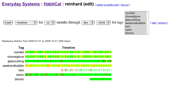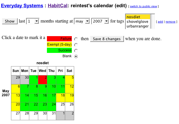What is the HabitCal Habit Calendar?HabitCal is a free online tool for tracking (and more importantly, building) good habits -- like diet and exercise. I came up with it specifically for my everyday systems habits, but you could use it for any habit you like. Hey! New! There's now an experimental mobile habitcal webapp. It's not quite perfect, but far enough along to be useful, I think. How it worksFirst, if you haven't already, create an account and log in. You'll then be redirected to this page except now that we know who you are there will be a personalized greeting with an edit link at the top. On the edit page, you'll see an empty list of "habits." Click on the "add" link next to this list to add a one word (no spaces) name for the behavior you'd like to track (browse other people's habits here). Then chose the time frame you want, make sure the habit you want to track is selected (you have to choose it from the list even if it's the only item there), and hit "show." A calendar will display for each month in the selected time frame for each habit. Mark green=success/yellow=exempt/red=failure (the habit traffic light) every day until you're no longer interested in tracking the habit. At the end of a month or a year, you'll have a striking visual picture of how well you complied with your desired behavioral goal. You can track several behaviors at the same time, and the interface makes it easy to set multiple days of input at once. If the full traffic light is too much, just use negative tracking to tick off failures when they happen. Besides your personal edit view, there is also a public view that you can share with friends and random people on the internet (NOTE: nothing here is private -- see disclaimer below). Just click "switch to public view" on the top of your edit page to see what this looks like. What it looks likeCalendar ViewThis is the most basic view. It's the most familiar and it's its good for tracking relatively small numbers of habits.