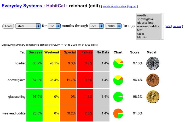 Statistics ViewThis gives you a statistical overview of your compliance over the selected period of time, the percentage of which you marked as success, exempt, or failure. "Special" (non-weekend or NWS) days are reported in a separate column to give you a quick overview as to whether you're abusing them. There's also a pie chart, a summary compliance score, and a personal olympics medal (if you deserve one!). The summary compliance score is calculated by the following crude formula: green / ( green + red ) - ( special percent exceeding 7%) I realize that this isn't a perfect scoring system for all people and all habits, and version 3 will let you choose between several scoring systems for each habit. I already hacked something for "weekendluddite" so that special days aren't penalized there. The personal olympics medals are given as follows: >= 98% Gold >= 96% Silver >= 92% Bronze This is more or less in line with what I've previously recommended for personal olympics (an average 0,1,2 failures per month, respectively).