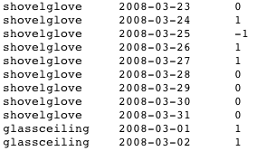 Export (TSV) modeTSV stands for tab separated values. This option lets you download your precious data to back it up or view it in excel or something. And if you're a programmer, you can build your own visualizer for habitcal data. The format is simple, 3 tab delimited columns: date, habit, and score (reported as 1/0/-1 for success/exempt/failure, respectively).
